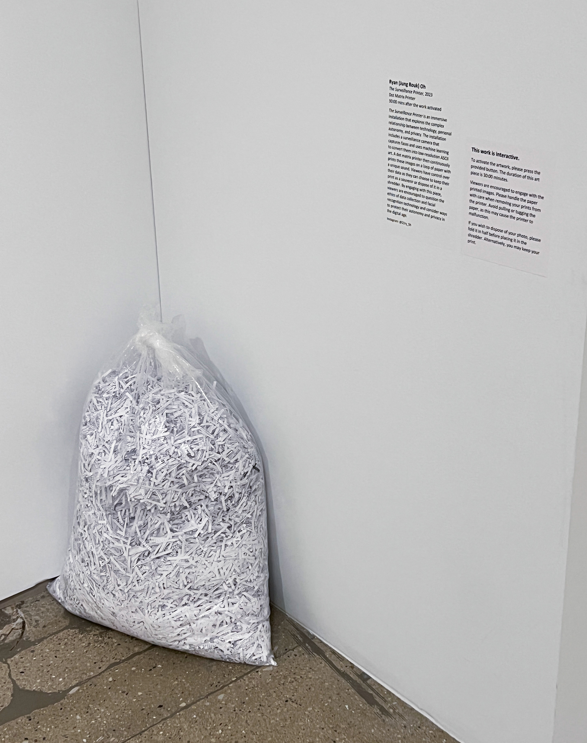 Upon entering the exhibition, visitors encounter six framed portraits crafted using ASCII characters. These portraits symbolize printers, drawing attention to the expansive digital landscape and highlighting the questionable practices of corporations in collecting and utilizing personal data. At the core of the installation is a file storage unit hosting a Dot Matrix Printer continuously fed with a stream of 2500 pages. On top of it sits a webcam cleverly shaped like a CCTV camera, featuring facial recognition capabilities. This arrangement initiates a nuanced interaction between technology and human engagement, representing the intricate dynamics of privacy and surveillance in the digital era.